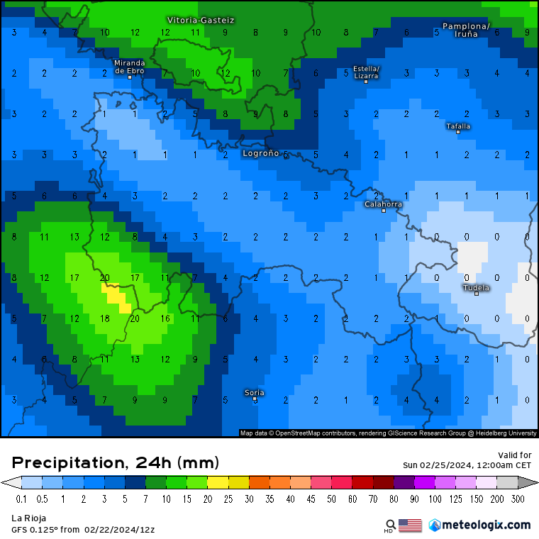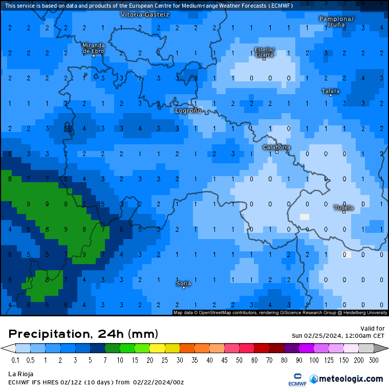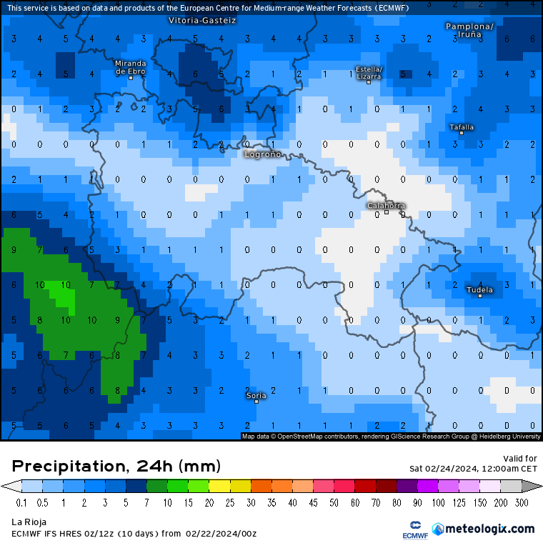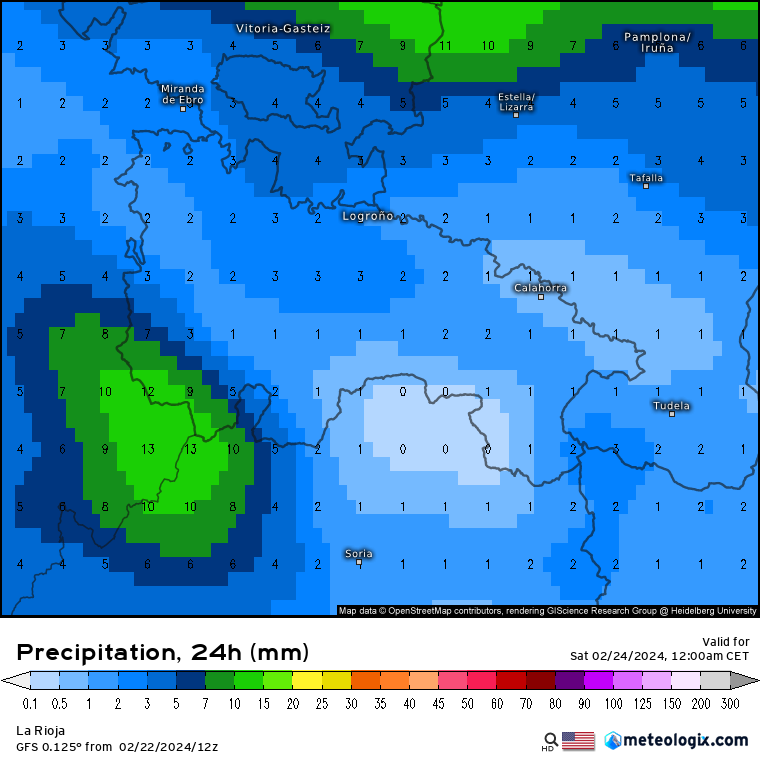 - SÁBADO 24 DE FEBRERO. Situación similar, con las mayores precipitaciones estimadas en la Ibérica occidental (10 litros de media) y ribera media (2/4 litros, algo más de manera puntual). Respecto a la nieve, la cota seguirá rondando los 800 metros y aunque no se descartan acumulados leves (1/3 cm) por encima de estas cotas, volverá a ser por encima de los 1200 metros donde los acumulados podrían sumar otros 5 cm, lo que sumado a los del día anterior, ya podríamos superar los 10 cm, sobre todo en Demanda y Urbión, y en menor medida en Cebollera.
