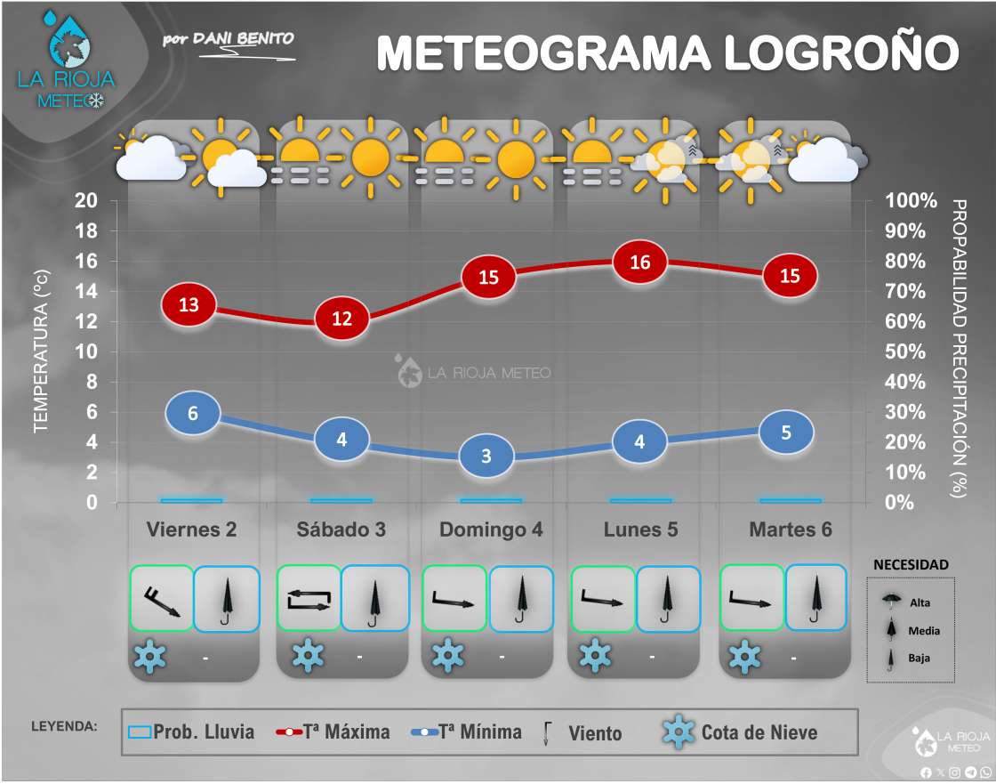 Seguiremos al menos durante los próximos 5/7 días bajo la campana de las altas presiones, esta vez con un potente anticiclón cantábrico sustentado en altura por una dorsal de estabilidad. Sin embargo, parece que irá perdiendo entidad con el paso de los días y cada vez será menos potente. Durante el viernes, la ubicación de las altas presiones favorecerá la entrada de flujo de norte, con la consiguiente llegada de estratos de nubosidad baja desde el cantábrico a La Rioja y un descenso térmico y la ruptura de la inversión térmica gracias al Cierzo. Durante el sábado y domingo, el núcleo anticiclónico volverá a moverse al Este, lo que favorecerá cierto establecimiento de condiciones de inversión de nuevo, vientos en calma o con toques del SurEste y riesgo de aparición de nieblas, aunque de aparecer, serían locales y más dispersas. Las temperaturas, se recuperarán, pero en la ribera estarán supeditadas a la aparición o no de esas nieblas.