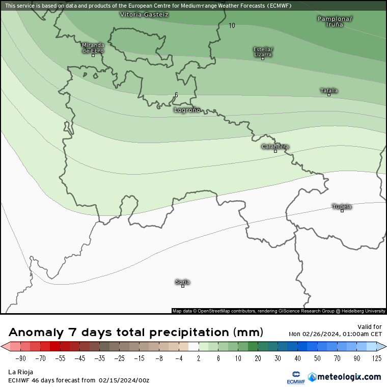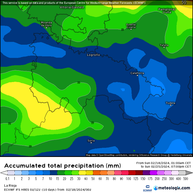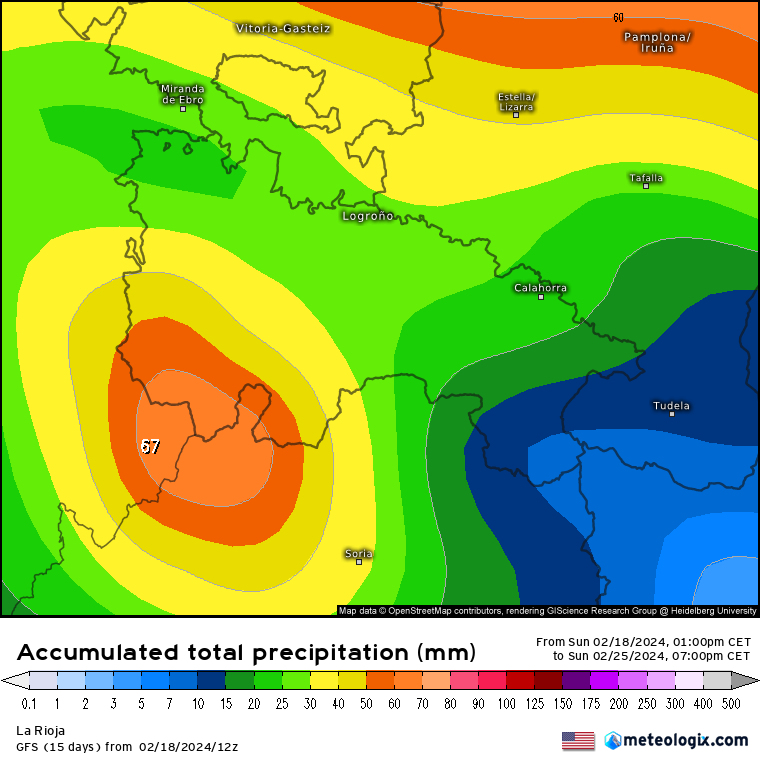 Sin duda. A partir del jueves serán varios los frentes que atraviesen La Rioja. Sin embargo todavía es pronto para afinar realmente en los acumulados, pues todo depende de la velocidad del paso de esos frentes (que en principio será rápido por el fuerte viento) y del ángulo con el que penetren en la región. Muestra de esta incertidumbre podemos visualizar el acumulado previsto hasta el domingo 25 de febrero por los dos grandes modelos de referencia, siendo el europeo-ECMWF (izda) menos generoso que el americano-GFS (dcha). El rango de diferencia es muy amplio, tanto en la ribera (15/30 litros) como en la Ibérica (30/60 litros). Lo que está claro es que lloverá.