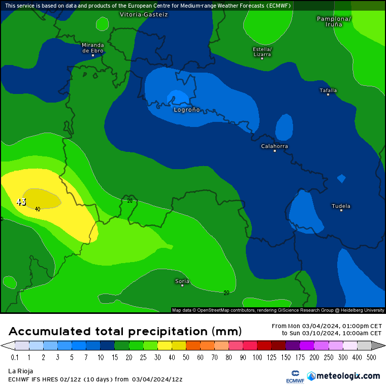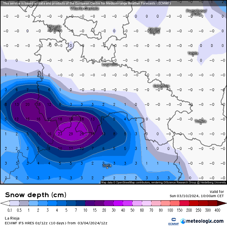 De nuevo, las mayores precipitaciones se darán, en la Ibérica en la segunda mitad de la semana, con un probable marcado foehn que nos llevará a hablar de acumulados que podrían superar de nuevo los 50/60 litros en Urbión, cara sur de Cebollera y el alto Najerilla (área de las 7 Villas). En el resto de la región, como vemos, tendríamos acumulados descendentes desde la preibérica occidental y media (20/30 litros), ribera alta (10/15 litros), ribera media (5/10 litros) y ribera baja e Ibérica oriental (2/5 litros).