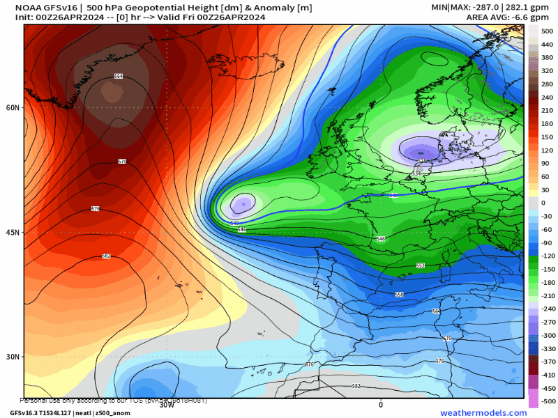 Seguimos con un anticiclón de las Azores posicionado al Norte de su posición, aunque dinámico y basculante que tiende a unirse a otros pequeños núcleos anticiclónicos en latitudes altas, lo que permite que su espacio sea ocupado por un gran sistema de aire frío en altura (a 500 hpa, unos 5500 metros, tendremos isotermas de entre -25/-30ºC), que a modo de goteo de pequeñas borrasquitas o bolsas frías, vayan visitando la Península Ibérica durante los próximos días. Algunas de ellas terminarán siendo DANAS (Depresión Aislada a Niveles Altos) o BFA (Borrasca Fría Aislada), por lo que la distribución de las precipitaciones y los frentes asociados todavía muestra una alta incertidumbre. En cualquier caso, tras una primera “borrasquita” para este fin de semana, esperamos otra para el inicio de la semana que viene, por lo que tenemos inestabilidad asegurada para los próximos 5 o 6 días, como mínimo.