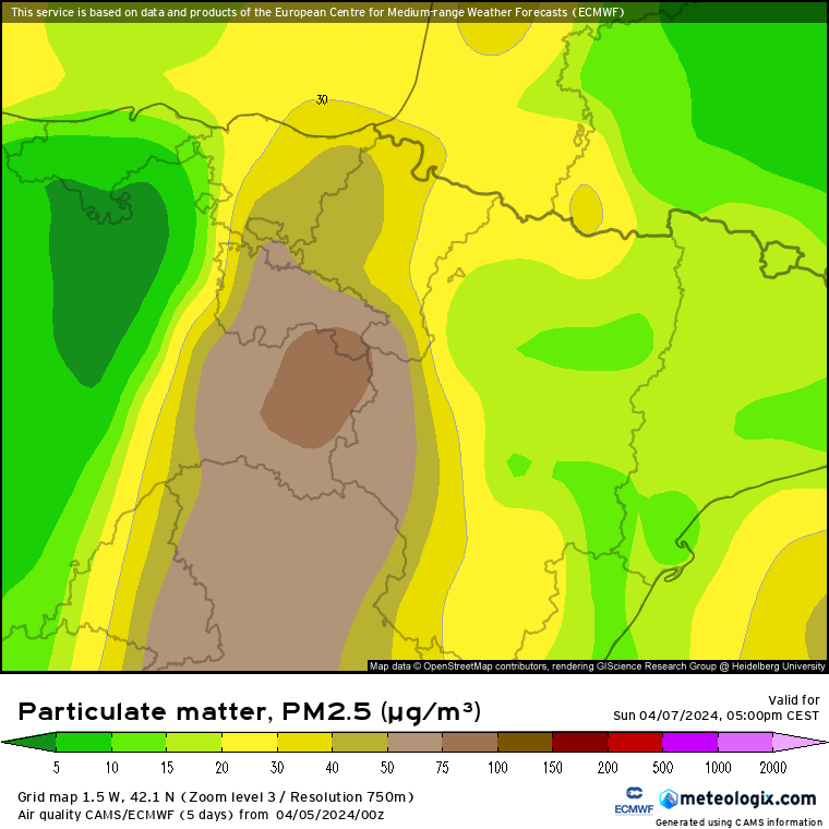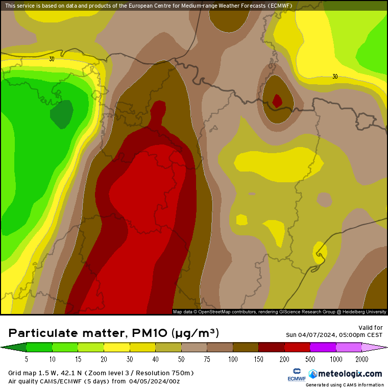 - Respecto al parámetro PM 2,5 (partículas inferiores a 2,5 micras), encontramos rangos de peligrosidad similares desd el sábado por tarde hasta el domingo por la tarde, con 50-100 microgramos/m3, considerándose extremadamente desfavorable para la salud cuando se superan los 75 microgramos, algo que podría suceder a lo largo del domingo.