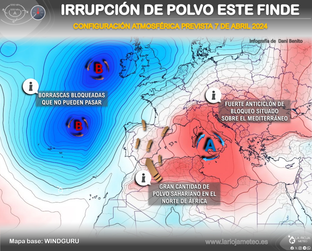 La llegada de la borrasca Olivia al oeste de la Península Ibérica y la persistencia de un anticiclón sobre el mediterráneo, van a interaccionar formando un perfecto pasillo de vientos del sur desde el norte de África hasta La Rioja. Como consecuencia, además del intenso calor para la época que sentiremos este sábado 6 de abril, nos despediremos de ver los cielos azules, pues además de la nubosidad media y alta, la calima será el fenómeno meteorológico más interesante durante el sábado y domingo. Si bien, durante la jornada del domingo, el polvo se combinará con las tormentas para dar lugar a probables lluvias de barro en la región.