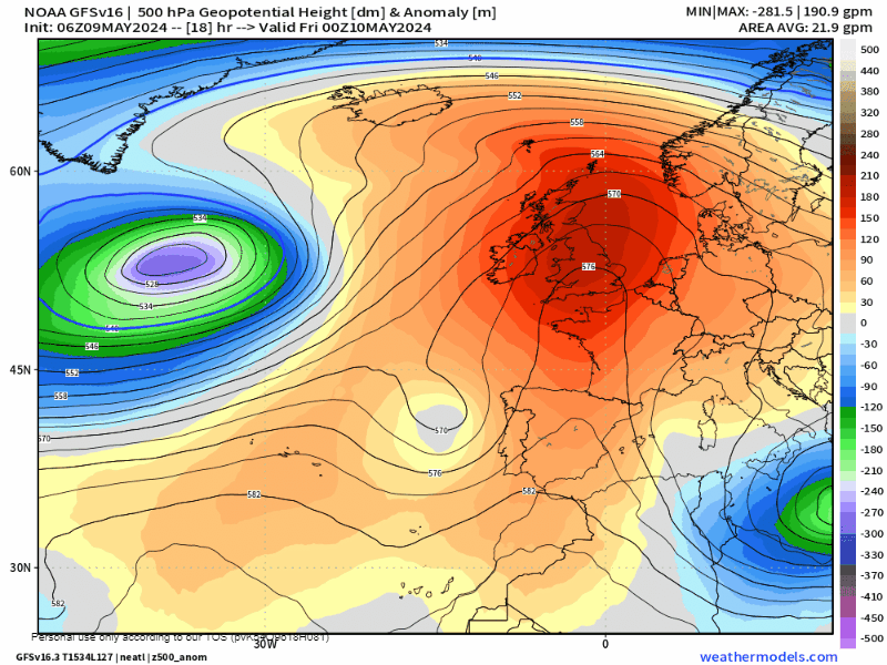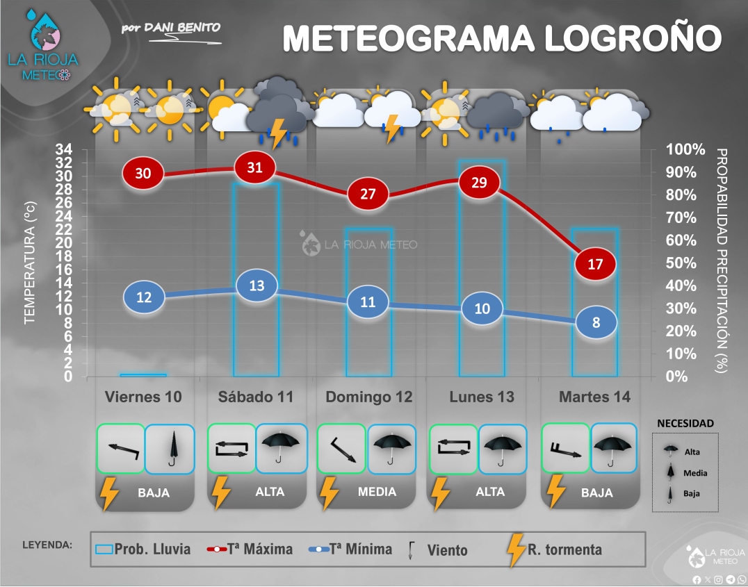 Pese a tener dominio general anticiclónico durante este fin de semana en superficie, una pequeña onda de inestabilidad acompañada de aire frío en altura (-16/-18ºC a 5000 metros) será capaz de atravesar el norte de la Península Ibérica durante el sábado. La combinación de calor en superficie y aire frío en altura dará como resultado la formación de tormentas durante el sábado en La Rioja. Además, de cara al domingo seguiremos con aire frío en altura y calor en superficie (aunque algo menos) por lo que también podríamos ver fenómenos tormentosos en la región aunque en principio algo más autolimitados. Ya de cara al lunes, el aire frío sobre nuestra vertical servirá de atractor para que una vaguada «se tire» sobre nosotros el lunes. Esta vaguada vendrá acompañada de un jugoso frente frío, que dada la subida térmica prefrontal prevista para el lunes, podría desencadenar a su llegada más tormentas y probables líneas de turbonada (líneas tormentosas bastante violentas). Tras el paso del frente del lunes, en la madrugada al martes, las temperaturas volverán a desplomarse por la descarga de aire frío postfrontal y volverá el Cierzo, que seguirá acercándonos chubascos durante esta jornada.