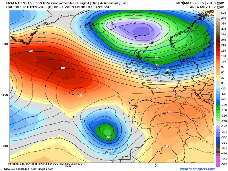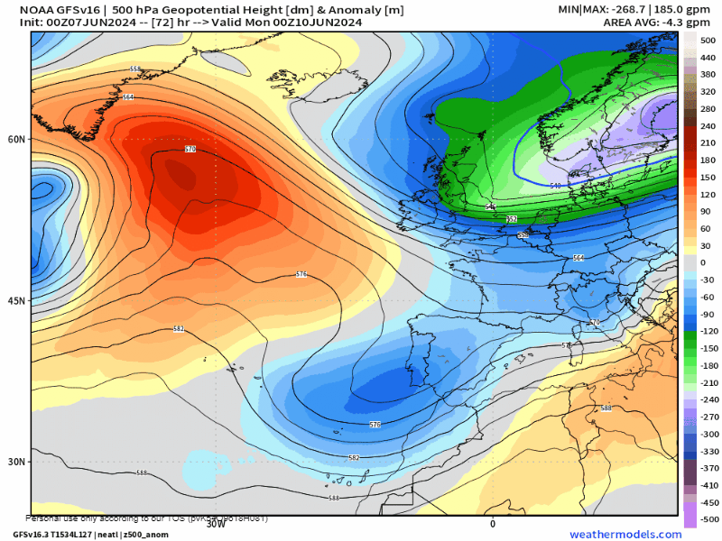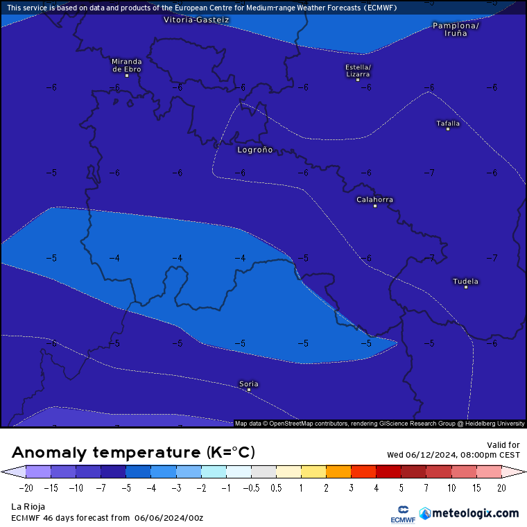 Además de las lluvias, ojo a las temperaturas entre el domingo 9 y el jueves 13 de junio, pues serán anómalamente frías, con anomalías que podrían rondar los -7ºC en torno al próximo miércoles, pudiendo nevar en cotas de 1800/2000 metros.