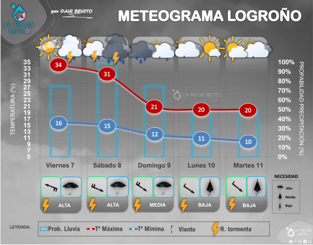 - VIERNES 7 DE JUNIO. Comienzo de jornada tranquilo, con nubosidad de tipo alto y CALIMA. Por la tarde crecerá nubosidad de evolución de manera más intensa que el día anterior, con tormentas que afectarán de manera localmente moderada con mayor probabilidad a los valles centrales de la región (Iregua, Najerilla y Leza). Vientos del SurEste. Temperaturas que podrían ascender ligeramente. Ribera: 33/35ºC y 15/17ºC || Ibérica: 28/30ºC y 12/14ºC.