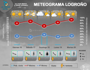 De tal manera, tedremos un viernes marcado todavía por el calor en La Rioja que sin embargo empezará a notar la llegada del frente tormentoso en las últimas horas por el Oeste y se irá extendiendo durante la madrugada al sábado por toda la región. Todavía durante la primera mitad del sábado tendremos lluvias moderadas localmente fuertes repartidas por toda la comunidad, aunque irán a menos por la tarde. Lo que también notaremos es un importante descenso térmico durante esta jornada. No se descarta que a últimas horas del sábado se reactiven algunas tormentas desde el Oeste hacia el Este, aunque sólo las ven algunos modelos. Veremos. El domingo el tiempo por la mañana estará más tranquilo y las temperaraturas tenderán a recuperarse ligeramente, combustible en forma de «calor» que facilitará la formación de tormentas por la tarde, que podrían ser localmente intensas.