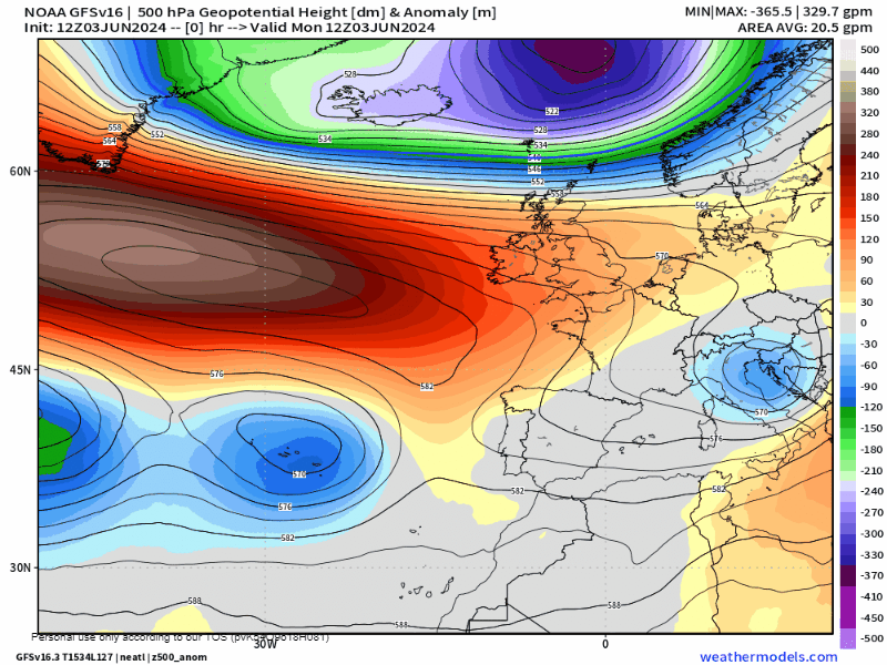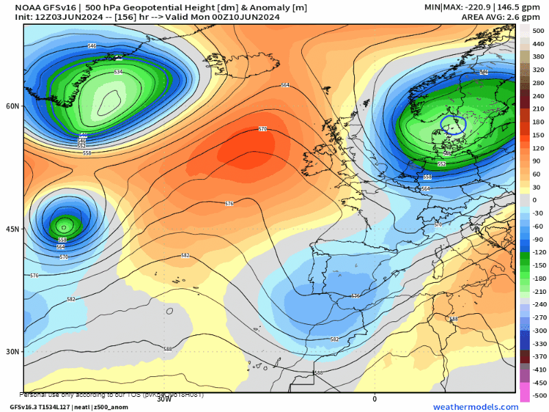 El anticiclón de Azores seguirá desplazado al norte, al Oeste de las islas británicas, y desde esa posición favorecerá que los restos del jet stream en forma de bolsas frías o DANAs, de movimiento errático por el atlántico, se cuelen por el flanco sur del azoreño y probablemente vayan a parar al entorno del golfo de Cádiz justo para comenzar el fin de semana. Aunque con gran incertidumbre en la posición y trayectoria de la DANA, todo apunta a que se desplazará desde el suroeste al noreste entre el viernes y el domingo, como podemos ver en la animación. Tras un pico térmico que tendremos en torno al jueves 6, Esto a su vez producirá un progresivo descenso de las temperaturas, que será más acusado en torno al domingo 9 de junio, día de La Rioja.