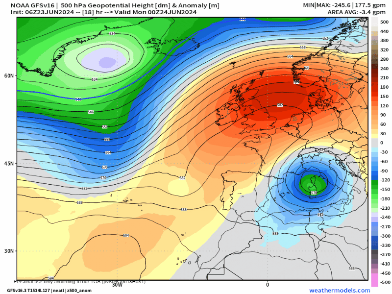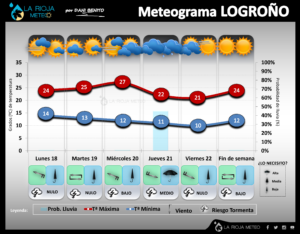 Como si se tratara de una «repetición de la jugada», ésta semana se parecerá en gran parte a la anterior en La Rioja. Pese a que iniciaremos la semana con un rotundo sol y un NOTABLE ASCENSO TÉRMICO, volverá a ser el preludio de la llegada de una vaguada atlántica que tenderá a estrangularse y formar una nueva DANA sobre la Península Ibérica. De hecho, la subida térmica del lunes y martes se corresponderá con el acercamiento de un frente por el Oeste, que provocará precisamente esa subida de temperaturas denominada «subida prefrontal». Aunque el propio martes y miércoles ya se podrían producir algunos eventos tormentosos, no será hasta el miércoles-noche y durante la jornada del jueves cuando la situación «rompa» con mayor intensidad, provocando probablemente una nueva situación de tormentas y lluvias generalizadas y localmente intensas, provocando a su vez un progresivo descenso térmico, que será más evidente en la jornada del jueves/viernes. No obstante, todavía hay INCERTIDUMBRE y el marco temporal podría verse ligeramente modificado. De cara al fin de semana, existen 2 escenarios que a dia de hoy todavía no están decididos: o que las temperaturas tiendan a remontar el sábado y bajar el domingo, o que queden frenadas por el roce de una nueva vaguada cuya mayor consecuencia será la instalación del Cierzo, nubosidad y, por ende, un nuevo fin de semana fresco. Lo iremos viendo.