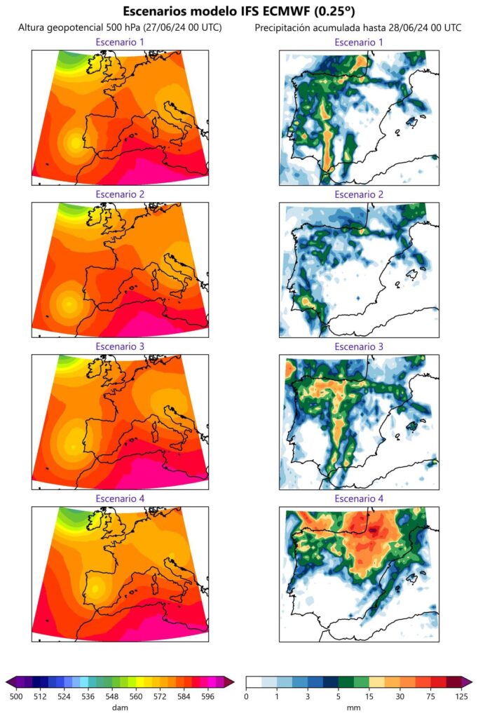 El único modelo que se desmarca de todos los demás es el europeo ECMWF, que traslada la DANA y las tormentas al fin de semana (viernes, sábado y domingo)….y es que sólo el 25% de sus escenarios plantean una situación parecida a la que plantean los demás. Bien es sabido los patinazos que últimamente ha tenido este modelo. A día de hoy, estos son los escenarios que plantea en función de la ubicación de la DANA a 500 hPa y las precipitaciones totales asociadas. Las diferencias son evidentes.