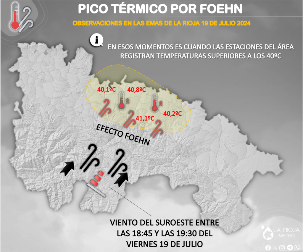 Fue en la comarca de #Logroño donde SI se superaron los 40°C en un breve periodo, en el que el role temporal a vientos del SurOEste favoreció ese ascenso por el efecto foehn. Recordemos que el #efectofoehn provoca un pequeño ascenso térmico a sotavento de la cordillera en la que incide el viento. Por las condiciones orográficas y ubicación, fue la comarca de Logroño la más afectada superándose los 40°C entre las 18:45 y 19:30 en localidades como #Cenicero, #Albelda, #Nalda, #Entrena, y el Oeste de la propia capital, entre otras.
