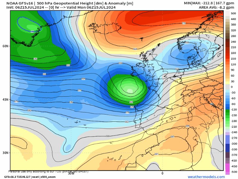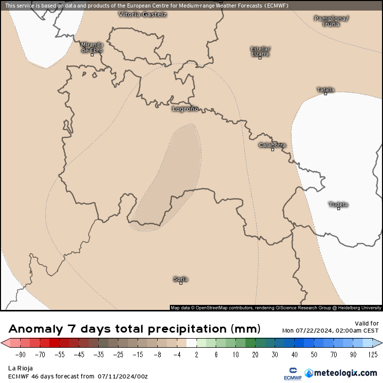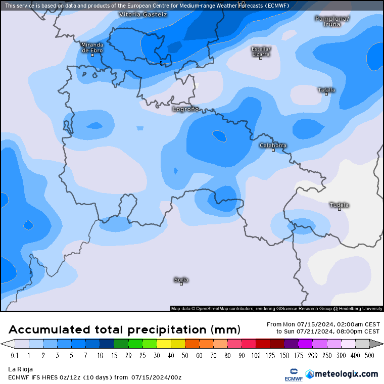Como decía, las precipitaciones no serán significativas durante toda la semana, si acaso se podrían escapar algunas gotas derivadas del paso del frente del lunes 15 y del sábado 20 de julio, pero muy poca cosa. Como podemos ver en la estimación para toda la semana por el modelo europeo.