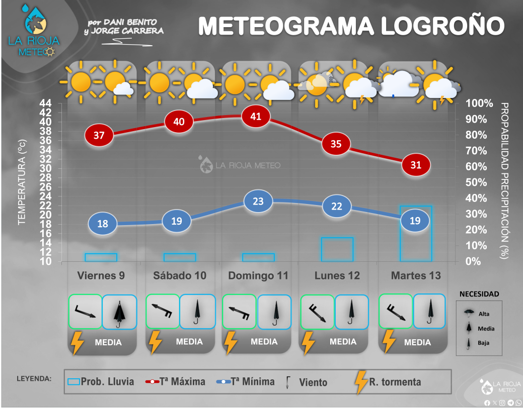 El reforzamiento de la dorsal africana sobre la Península Ibérica y la posición de altas presiones en el mediterráneo, favorecerán que durante los próximos 3 días tengamos un nuevo episodio de calor extremo en La Rioja, especialmente las máximas del sábado y domingo, y las mínimas del domingo y lunes. Con esta configuración nuestro querido Cierzo se verá truncado durante el sábado y el domingo, y sin nuestro ventilador natural, las temperaturas se dispararán a valores alrededor o por encima de los 40ºC. Como ya adelantábamos en nuestras redes sociales, el acercamiento de una vaguada por el Oeste provocará un repunte térmico durante el fin de semana, aunque una masa atlántica más fresca tenderá a ir desplazando a la masa cálida africana a partir del lunes por nuestras región, dando por finalizado el episodio por estos lares. Si quiere ampliar más en la predicción de los modelos pueden echar un vistazo a nuestro meteoanálisis en este enlace.