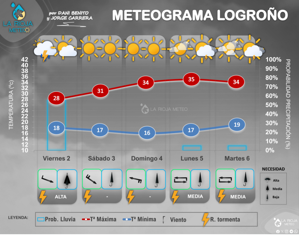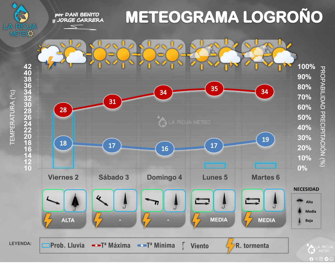 Y tras 3/4 días de temperaturas disparadas de día y de noche, el tránsito de una pequeña vaguada nos trae el “esperado respiro” a La Rioja. La llegada de esta pequeña vaguada con un maltrecho frente asociado llegará en las primeras horas del viernes, sin descartar que incluso pueda llover algo en la región. De cara al sábado y sobre todo al domingo, la dorsal anticiclónica africana volverá a abrazarnos, volviendo a favorecer un aumento térmico y una alta radiación solar por la ausencia de nubes. Verano de nuevo, al fin y al cabo….aunque con temperaturas más normales para la época. Quizás en torno al martes una pequeña onda de aire frío que recorre el atlántico podría llegar a nosotros, con algo más de evolución y riesgo de nuevo de alguna tormenta, aunque por el momento no es el escenario más probable, pero si el único que supondría un cambio respecto al continuismo del calor.