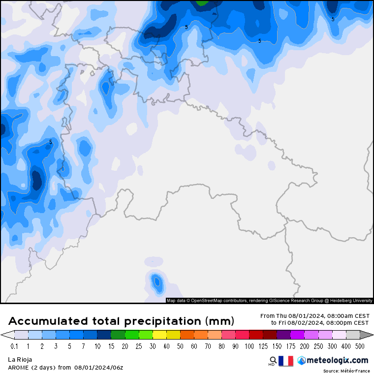 Como decía, durante la primera mitad del viernes, un frente podría afectarnos de manera tangencial a La Rioja, aunque los diferentes modelos no son precisamente muy optimistas en la cantidad de precipitación que pudiera dejarnos. Con suerte, las comarcas noroccidentales podrían recibir entre 2/4 litros atendiendo al modelo AROME. No esperamos más lluvia ni el sábado ni domingo.