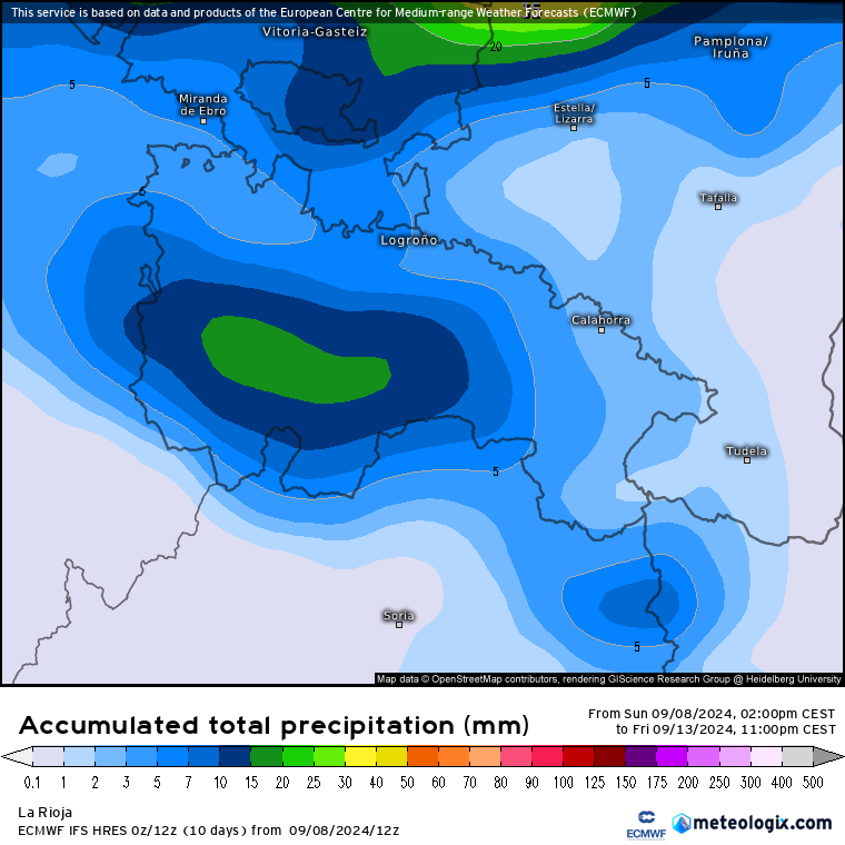 No esperamos precipitaciones significativas en La Rioja hasta la madrugada al jueves, cuando se espera que ese frente vaya avanzando hacia el sur de la cantábrica. Aunque no parece que los acumulados vayan a ser abultados, en la Ibérica si que podrían superar los 15 litros en torno al jueves 12 y viernes 13, sobre todo en cara norte de la Sierra de la Demanda, Sierra del Moncalvillo y Cebollera. Algo típico en este tipo de situaciones de norte en nuestra comunidad. Podrían producirse chubascos más débiles en la ribera alta y sierras orientales (< 5litros), y cada vez más débiles según vayamos descendiendo Ebro abajo.
