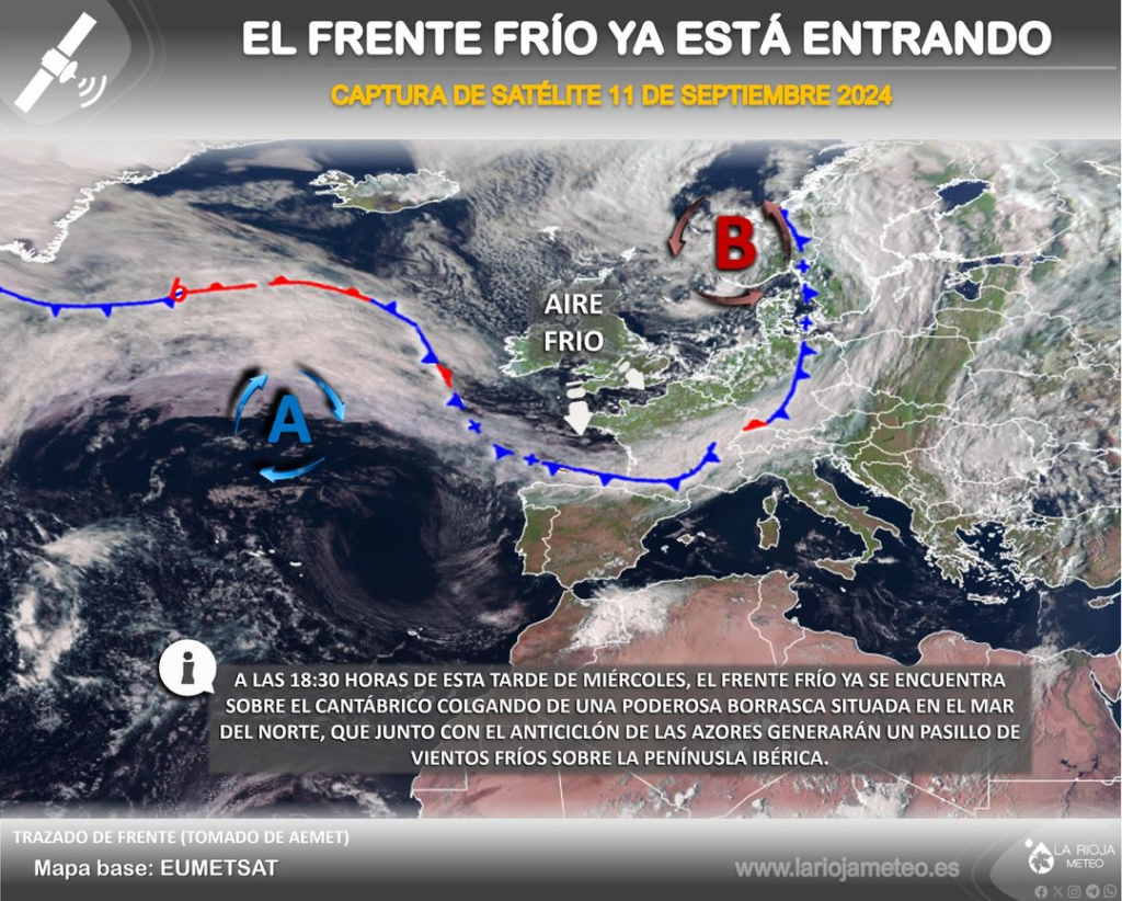Ya tenemos el #frentefrio a las puertas de la #PeninsulaIbérica. Aunque el frente no está muy armado, la masa de aire frío que lleva detrás se asentará durante los próximos días, provocando un moderado descenso de las máximas y una sensible caída de las temperaturas nocturnas.