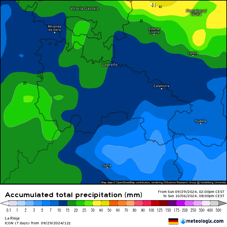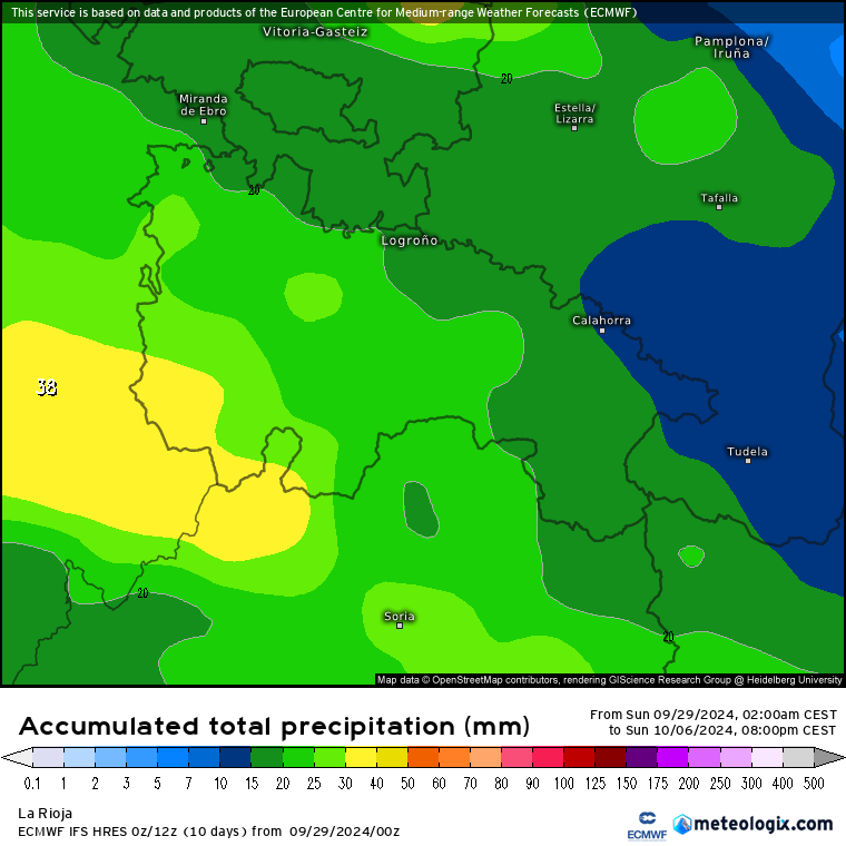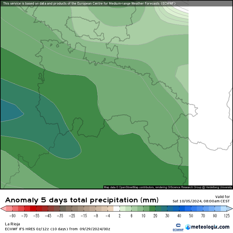 Respecto a las precipitaciones, caso de darse el escenario más optimista del ECMWF, nos muestra superávits de lluvia de casi 20 litros en la Ibérica suroccidental y entre 5/15 litros en el resto (más desde el suroeste en gradación al noreste de la región, donde menos exceso).
