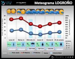 - Jueves con paso del frente y precipitaciones en la cara sur de la Ibérica (Urbión, cara sur de La Demanda, 7 villas y Cebollera). Apenas se esperan chubascos débiles y ocasionales en la ribera, algo más probables en la alta.