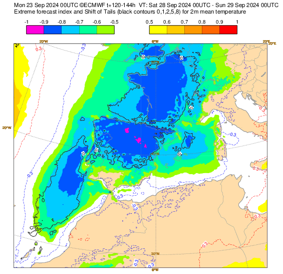 Como curiosidad, las temperaturas que esperamos entre el viernes 27 y sábado 28 serán inusualmente bajas, con índices EFI que rondarán los -0,8/-0,9 en La Rioja, lo que indica lo extraordinario del descenso previsto con máximas y mínimas más propias de finales de Octubre o incluso principios de noviembre. Recordemos que el índice EFI (Índice de tiempo extremo), toma en consideración la climatología de los últimos 40 años para calcular lo ánomalo de una situación, cuando estos valores está entre 0,8-1 (o su homólogo negativo) apuntan a una situación extremadamente anómala.