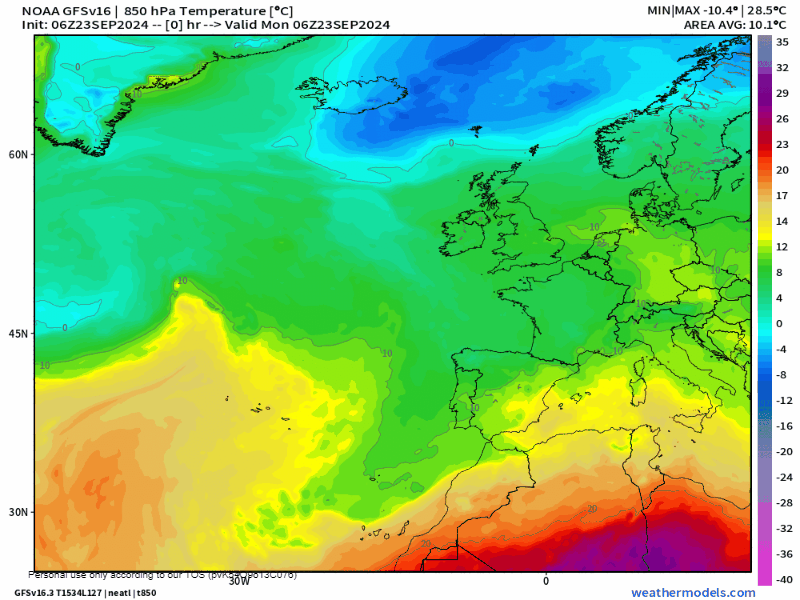 El acercamiento del frente atlántico propiciará un auténtico vaivén térmico entre el miércoles y viernes. Pasaremos de isotermas de unos 15ºC a 850 hPa (temperatura a 1500 metros de altura) a poco más de 1/2ºC. Lo que a nivel de superficie podría equivaler a unos 25ºC en área de la ribera durante el miércoles para pasar a 15ºC o menos de cara al viernes y sábado. No obstante, parece que el domingo iniciarían un ascenso. Podemos intuir esta llegada de aire frío a través de la siguiente imagen: