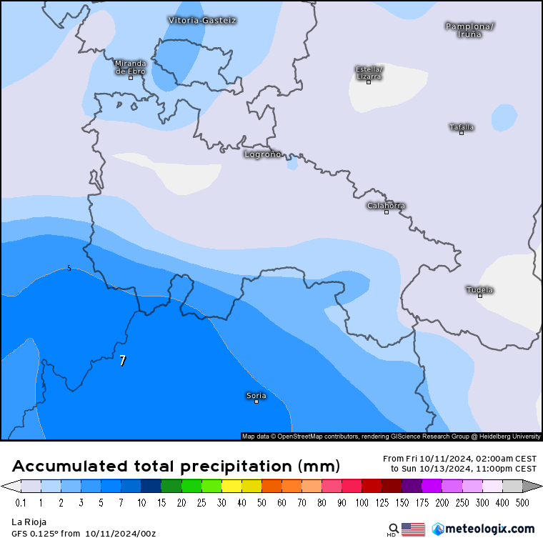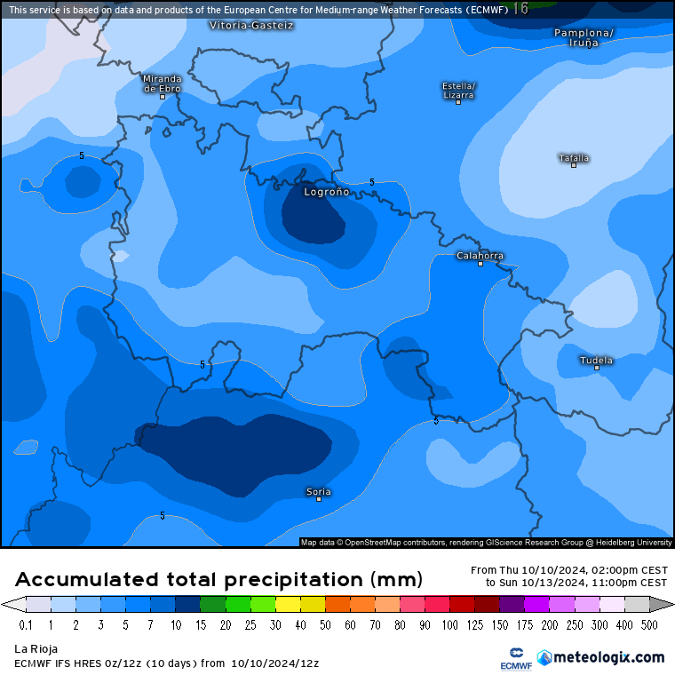 Como decíamos, no se espera que llueva de manera abundante en la región pero si lo podría hacer entre la tarde/noche del viernes y hasta la media tarde del sábado. Aunque todo depende de la capacidad de ascenso de los frentes que entrarán por el Oeste de Andalucía, el escenario medio (ICON, centro) es que apenas dejen 2/3 litros en la ribera y los 6/8 litros en puntos de montaña, otros modelos como el GFS (dcha) apenas ponen trazas de precipitación en La Rioja, y algunos son algo más optimistas (ECMWF, izda), como podemos ver a continuación.