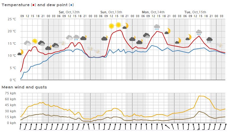 - DOMINGO 13 DE OCTUBRE. Cielos enmarañados de nubes altas, pero con más sol en toda la región. No se esperan precipitaciones. Los vientos seguirán soplando del SurEste. Las temperaturas mínimas descenderán ligeramente y las máximas ascenderán de manera acusada. Ribera: 21/23ºC y 11/13ºC || Ibérica: 18/20ºC y 8/10ºC.