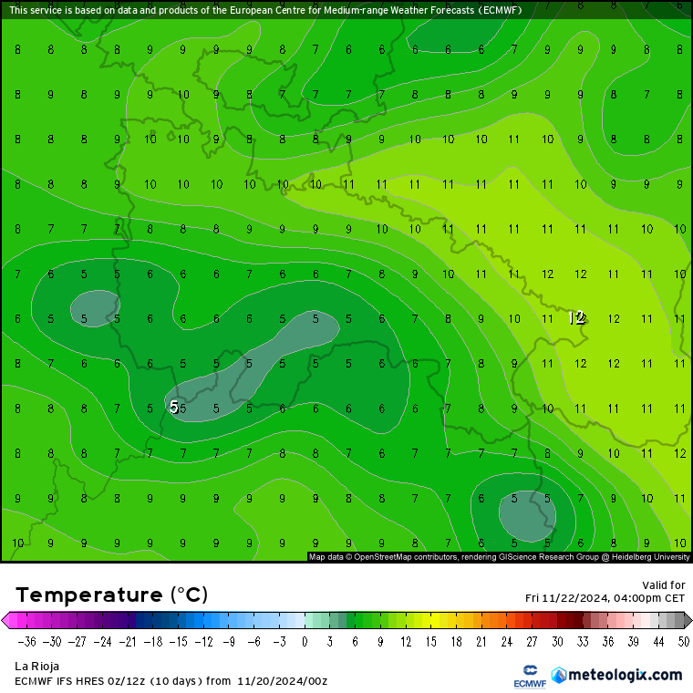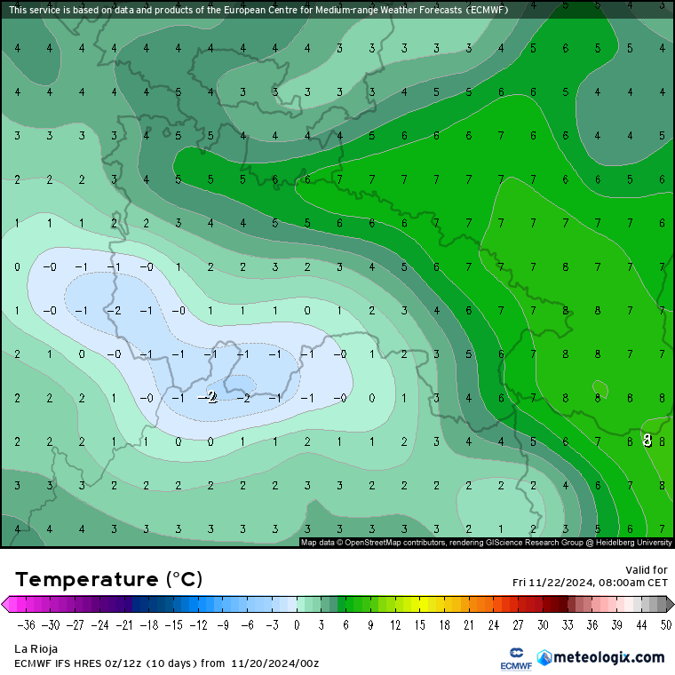 Hablamos de mínimas a las 8:00 del viernes en torno a los -1/-2ºC en la Ibérica occidental, los 0/2ºC en la Ibérica oriental y entre los 4/7ºC en la ribera (menos frío hacia la ribera baja).