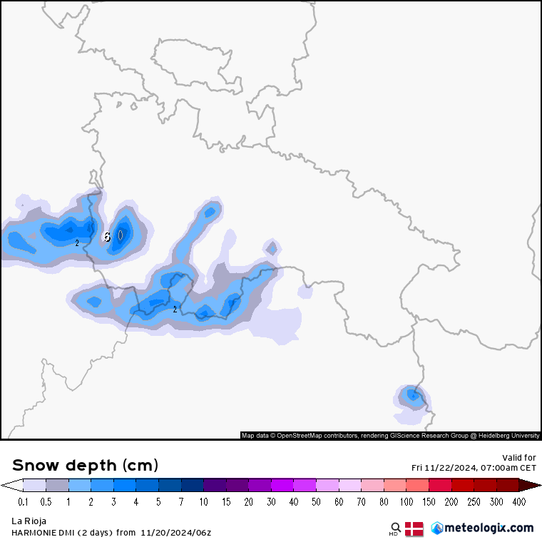 Desafortunadamente la cota de nieve se mantendrá alta (1700/1900 metros) al paso del grueso del frente. Aunque irá bajando progresivamente hasta los 1300 a lo largo de la madrugada, ya poca preciptiación quedará. Por ello se espera que con suerte se puedan ver 2/4 cm de nieve nueva en las cumbres de la Ibérica, aunque el modelo HARMONIE es algo más optimista con hasta 5 cm en la Demanda.