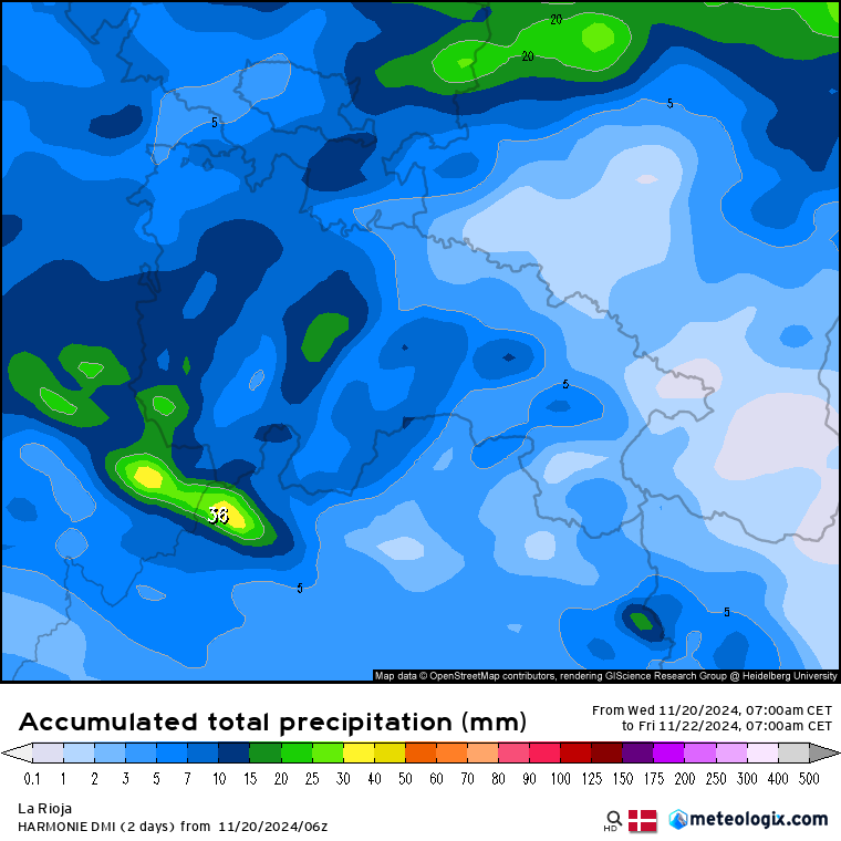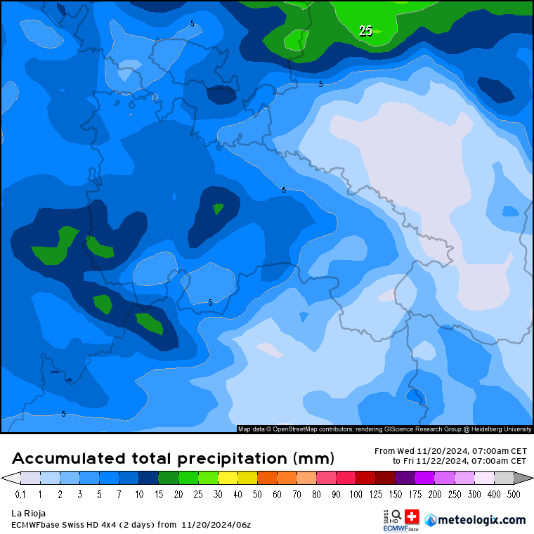 En base a los modelos HARMIONIE y SWISS-ECMWF, podrían recogerse entre 15/25 litros en áreas de la Demanda y Camero Nuevo, entre 10/15 litros en Camero Viejo y otros puntos de la sierra riojana occidental. Las Sierras orientales (Alcarama, Préjano, La Hez…) rondarían los 5/7 litros por lo general.
