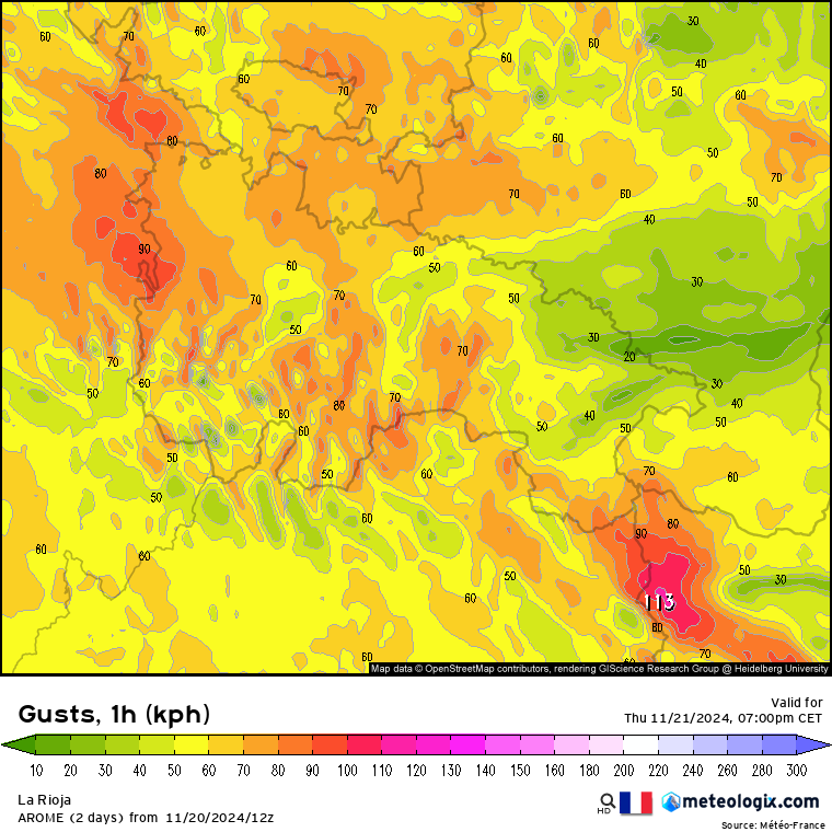 Situación breve y rápida, que nos dejará un claro aumento de la velocidad del viento en La Rioja, con rachas que podrían alcanzar y superar los 80/90 km/h en gran parte de la mitad occidental de la comunidad (tanto ribera como ibérica), quedáno a priori más protegidos del viento en las comarcas ribereñas orientales (Calahorra, Alfaro, Arnedo..).