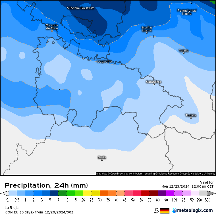 Esperamos precipitaciones débiles en áreas de montaña durante el viernes, derivado de la situación de nortes que esperamos y que en el valle se traducirá en Cierzo y algunos chubascos a lo sumo en áreas dela ribera alta, poca cosa a juzgar por el estimado del modelo ICON para el viernes. Serán de nieve por encima de 1100 a 1200 metros (mapa Izda).