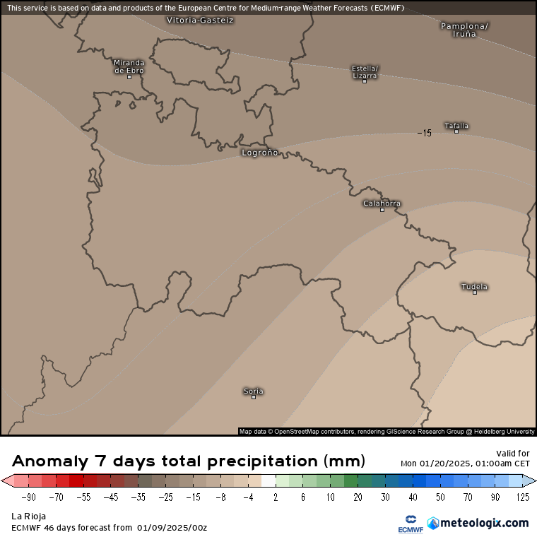 En lo que respecta a las precipitaciones, claro déficit, con entre -10/-15 litros menos de lo que normalmente suele caer esta semana en la comunidad.
