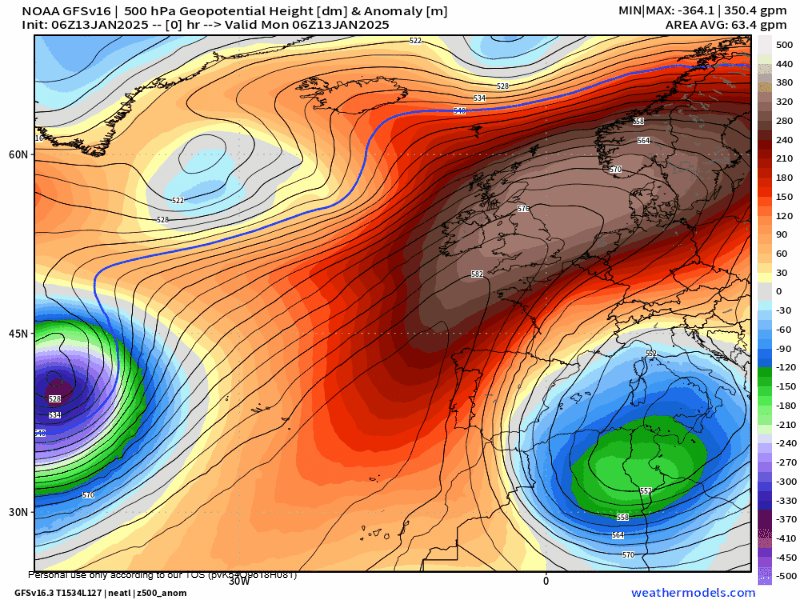 Tras una irrupción de aire frío polar sobre el viejo continente, una imponente dorsal anticiclónica se ha hecho dueña de la mayor parte de Europa, mientras que la única inestabilidad la encontramos en el sur, vía mediterráneo. El aire frío que se encuentra en el interior del continente está siendo trasladado hacia la Península Ibérica e incluso el norte de África, donde ya nos ha llegado un primer «arreón». Sin embargo se trata de una masa de aire muy frío pero muy seco (masa de aire de naturaleza polar continental) y por ello no esperamos precipitaciones ni prácticamente nubes en ésta primera mitad de la semana.