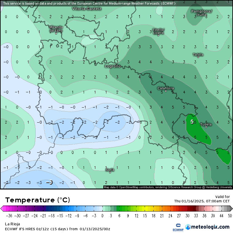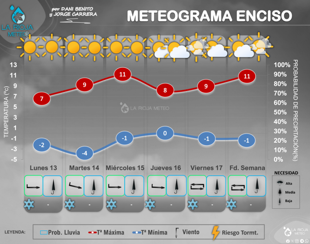En La Rioja sólo esperamos que se nos cuele algo de nubosidad durante el jueves y viernes de tipo bajo por el norte al principio y por el Este al final, sin descartar que llegue alguna traza de precipitación. Muy poca cosa en torno al jueves16/viernes17, alguna gota despistada más probables en las sierras orientales que podrían ser de nieve en cotas de 500/700 metros. Volvemos a repetir que salvo cambio, la situación no pasaría de algo anecdótico.