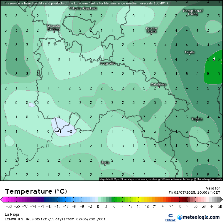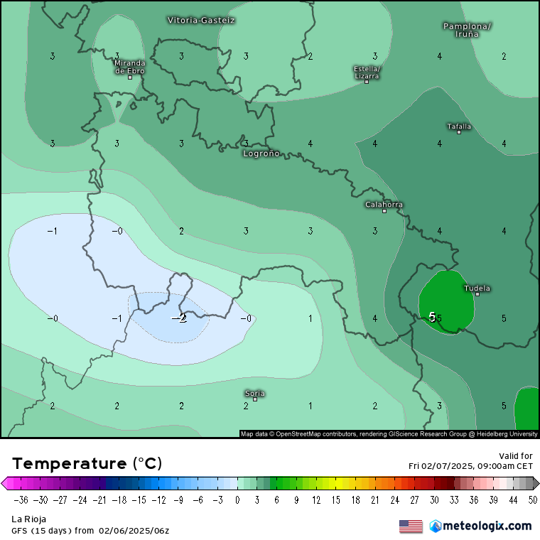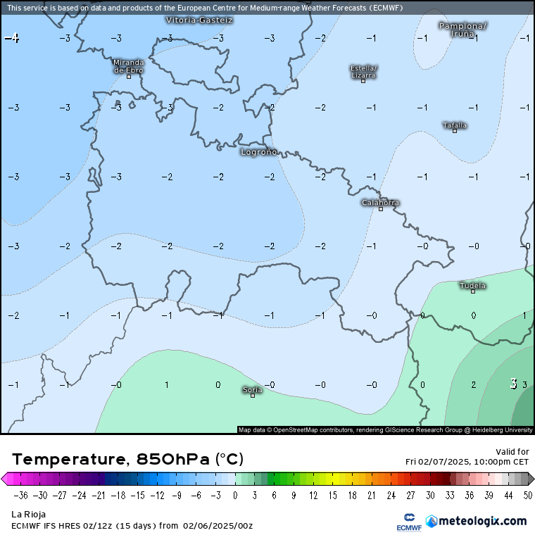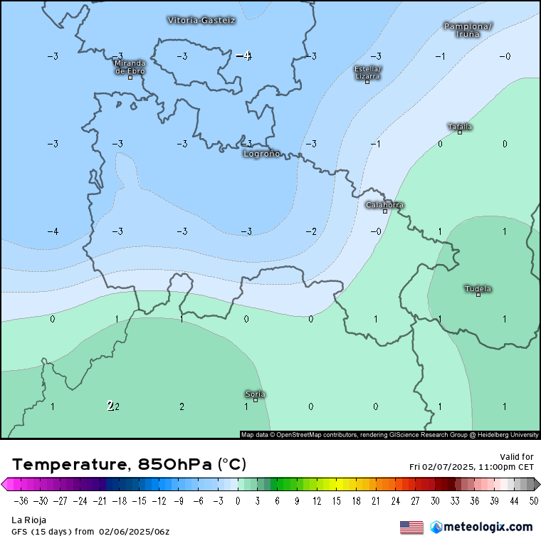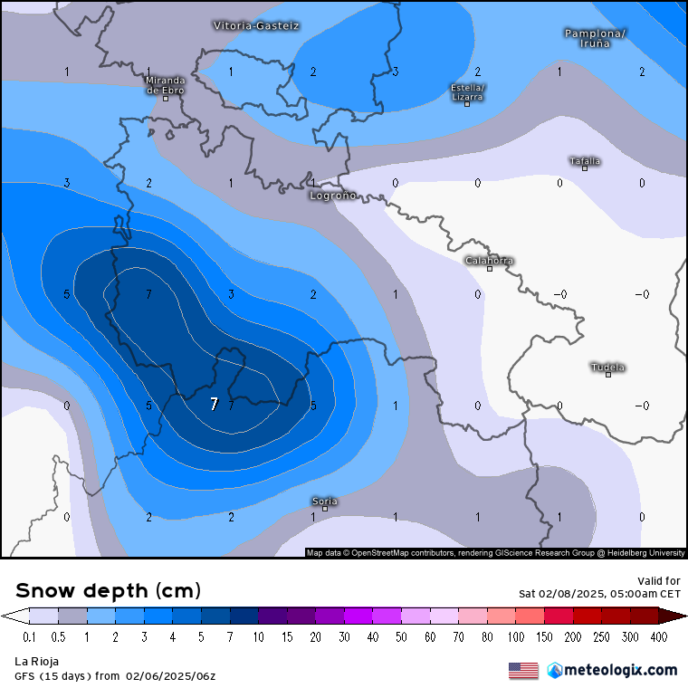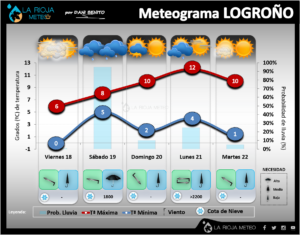 De 19:00 a 23:00: será el momento más interesante, ya que, con el segundo frente, se espera un descenso térmico que podría hacer bajar la cota de nieve hasta 500-600 metros, incluso puntualmente por debajo. Esto aumentaría la probabilidad de ver nieve en Logroño. Todo dependerá de la hora exacta de llegada del frente, ya que, previsiblemente, cuanto más se retrase, mejor, pues podría coincidir con masas de aire más frías, favoreciendo así la posibilidad de que la precipitación sea en forma de nieve