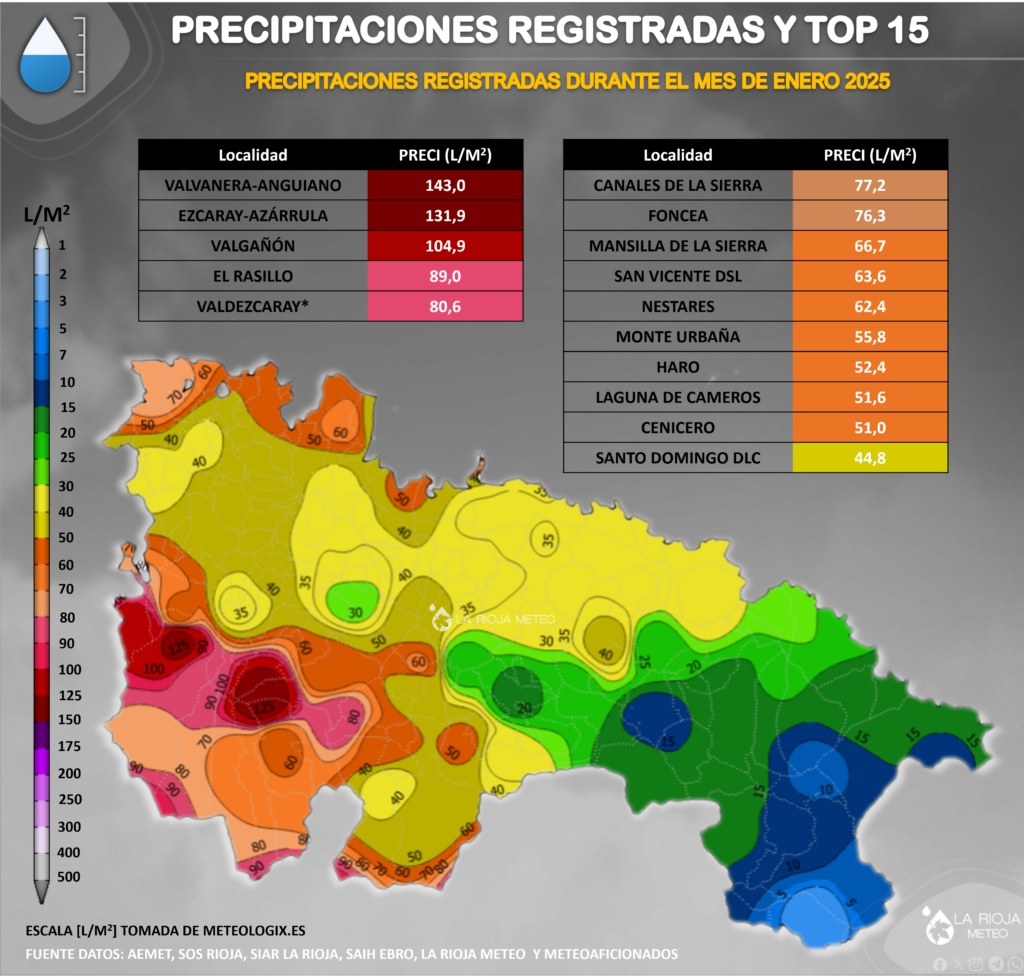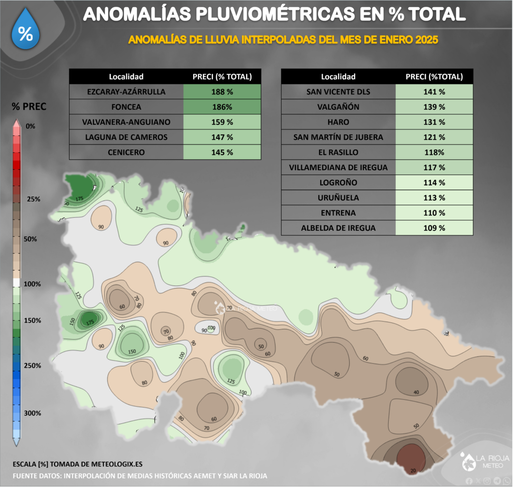 Partiendo de los datos climatológicos de AEMET del periodo de referencia 1981-2010, donde observamos que las precipitaciones medias para un mes de Enero en La Rioja rondan los 20/50 litros en la mayor parte de la ribera y los 60/100 litros en áreas de la Ibérica occidental, desde luego que estamos ante un mes de Enero con grandes diferencias entre las anomalías de la ribera y la Ibérica.