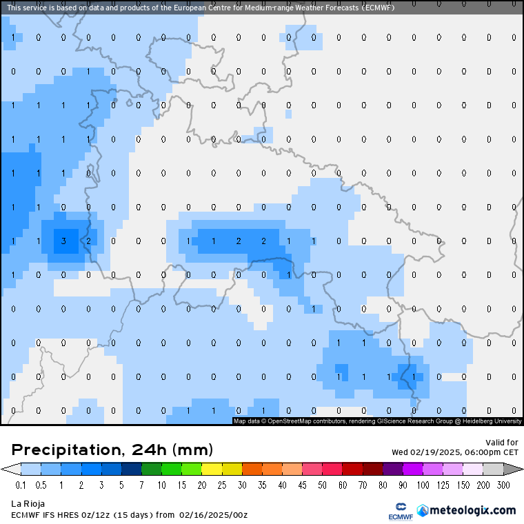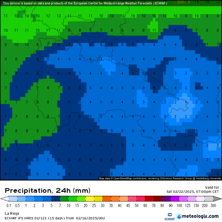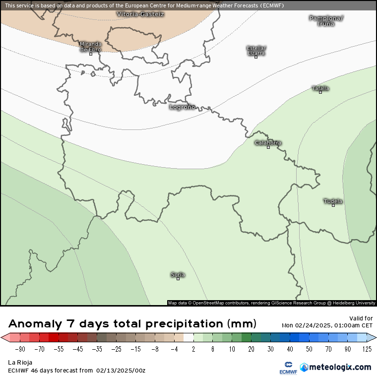 Respecto a las precipitaciones, el flujo general de componte sur (canalizado a Sureste en el Ebro) favorecerá que la mayor parte de las precipitaciones que lleguen a la región se queden en la Ibérica, donde si se ven trazas con un pequeño superávit. Sin embargo en la ribera, el efecto foehn nos mantredrá dentro de la normal o ligeramente más seco en contexto.