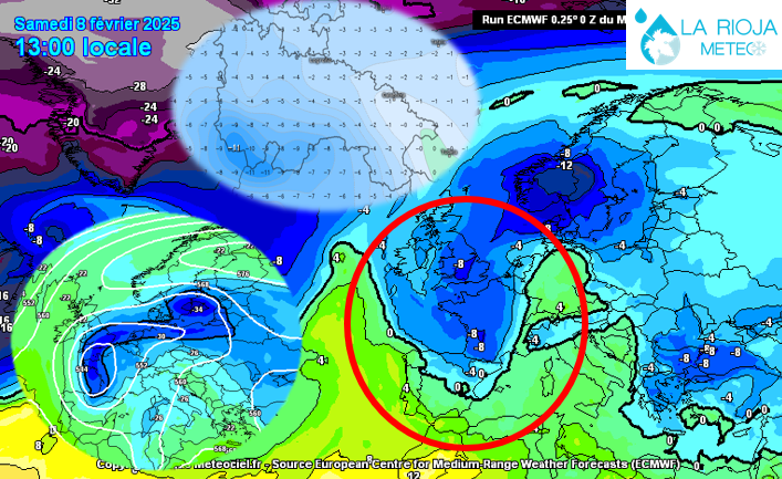La clave está en el anticiclón atlántico-escandinavo que bloquea la circulación habitual del oeste, lo que permite el descenso de una masa de aire frío polar-continental sobre Europa occidental. Esta configuración favorece una situación invernal marcada, con temperaturas de -4 a -6°C a 850 hPa (1.500 metros de altitud ) y valores de -30 a -32°C a 500 hPa (5500 metros), condiciones idóneas para episodios de frío intenso y nevadas en cotas bajas.
