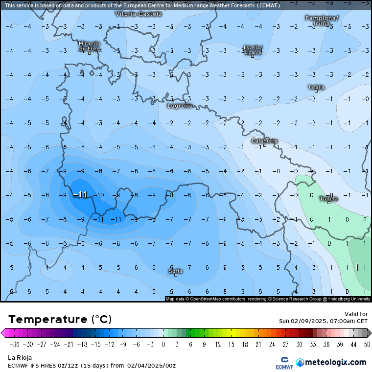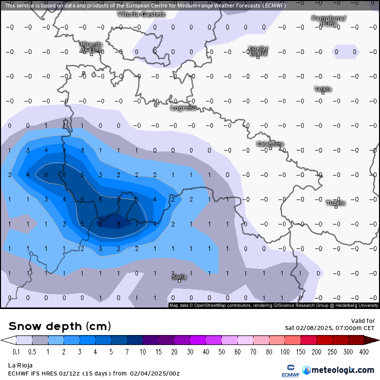 Según el modelo ECMWF, la cota de nieve oscilará entre 300 y 500 metros, permitiendo nevadas en zonas relativamente bajas. En la sierra de La Demanda se esperan acumulaciones de 5-7 cm, mientras que en áreas más bajas como Ezcaray y la parte occidental de La Rioja podrían registrarse entre 1 y 3 cm.