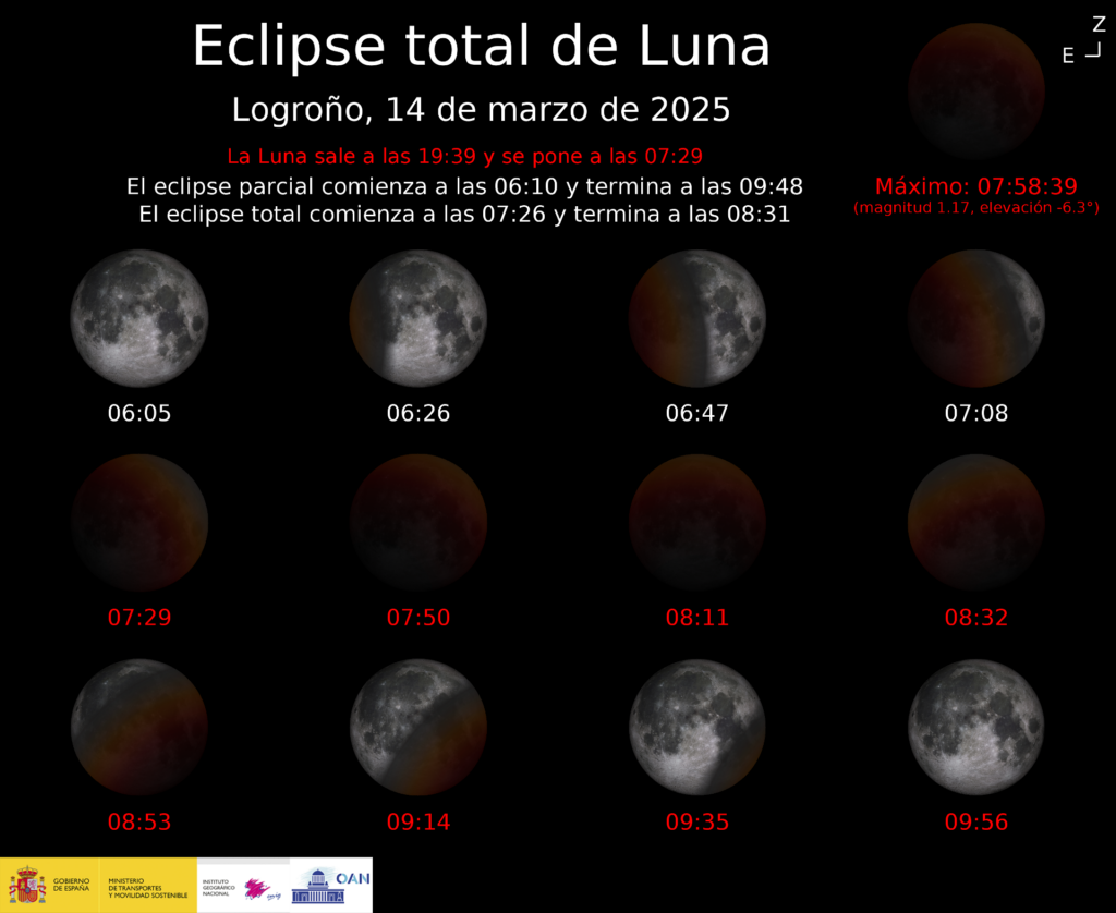 En Logroño, la Luna estará muy baja en el horizonte y se pondrá antes de que termine la fase total del eclipse. Aquí están los horarios exactos en horario local (CET):