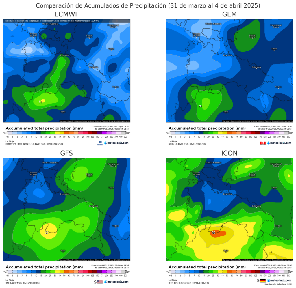 Sólo hasta el viernes, los diferentes modelos ya muestran diferentes escenarios en función de esa mayor o menor penetración de los frentes. A priori, casi todos nos marcan una situación más prolifica en cuanto a lluvias en la cara sur de la Ibérica con entre 25/40 litros en cara sur de Urbión, Cebollera, S. Préjano o Alcarama. Al valle, que las precipitaciones llegarán más o menos efectivas dependerá de que supere la barrera foehn, siendo la ribera alta la menos afectada.