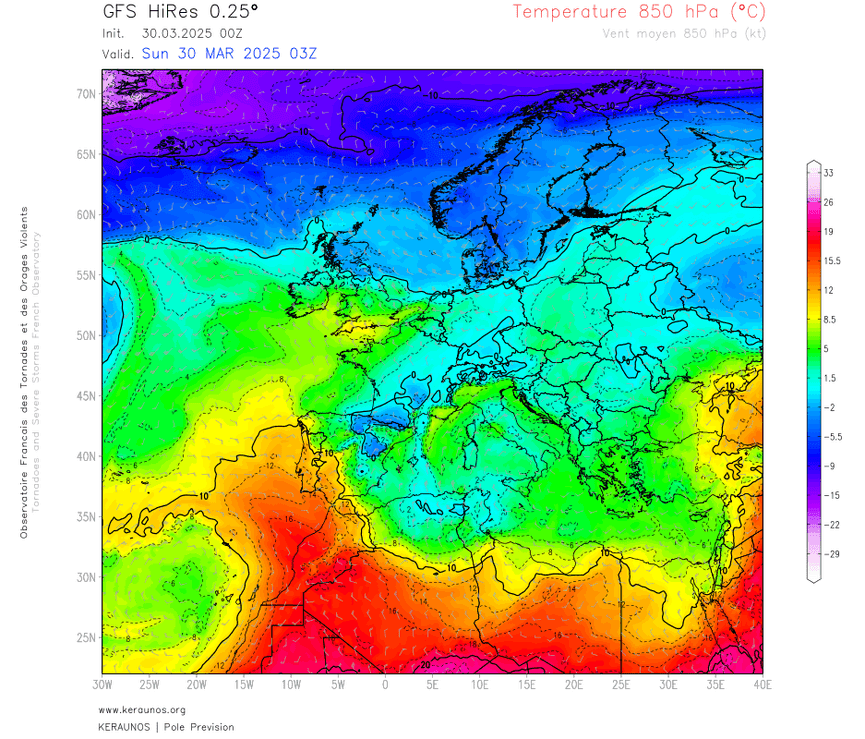 Podemos intuir estos cambios térmicos a través del mapa de temperaturas a 850 hPa (1500 metros), donde observamos los restos de la irrupción fría de este fin de semana (colores azules, isotermas de -1/-3ºC), para posteriormente sufrir esa advección cálida (colores naranjas y rojos, +8/+12ºC), y volver a transitar hacia los valores más frecos (verdes, +4/+7ºC).