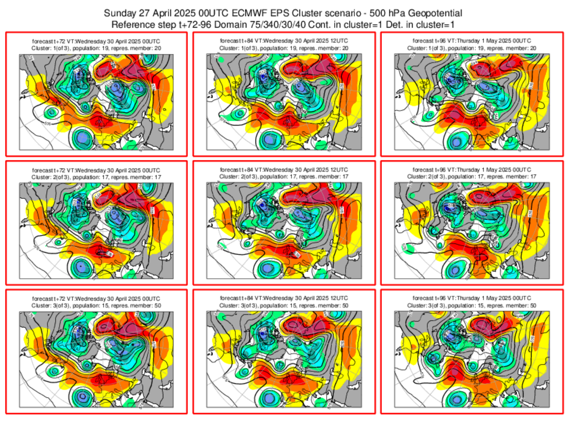 En este caso, el modelo europeo ECMWF muestra tan sólo 3 cluster posibles (agrupaciones de escenarios): la DANA se iría acercando poco a poco al Oeste de la Península, pero sin entrar decididamente en ella. En general todos ellos son bastante similares, con altas presiones migrando hacia las Británicas y CentroEuropa, y perdiendo influencia las altas presiones sobre el mediterráneo occidental, aunque resistiendo por efecto dinámico de la DANA al Oeste.