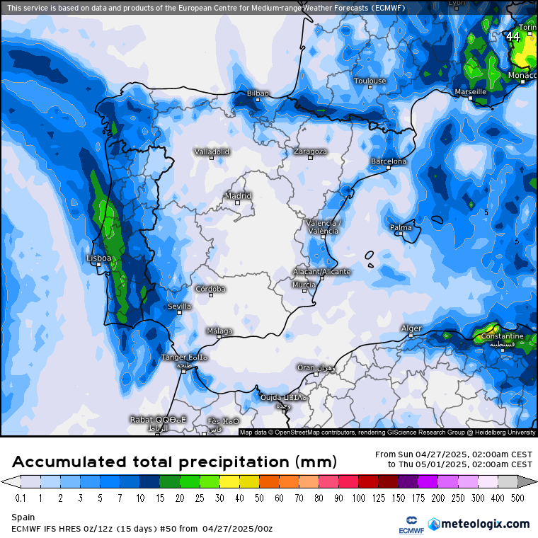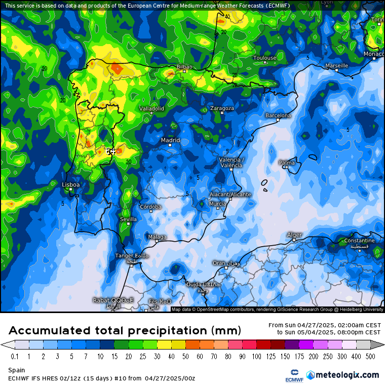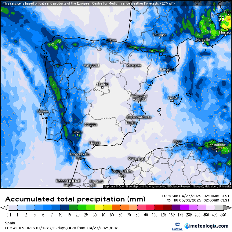 Lo vemos claramente en las precipitaciones totales acumuladas en cada uno de los escenarios que representan los anteriores clusters (o agrupaciones de escenarios). Obviando las precipitaciones del norte 8que son las que se están dando hoy domingo), el primer brazo de precipitaciones podría quedar o muy al Oeste o penetrar un poco más, en cualquier caso sólo la mitad occidental del país se vería afectada.