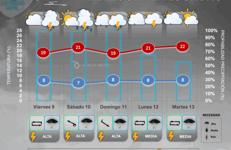 Entre el viernes 9 y el domingo 11, esperamos precipitaciones abundantes y muy repartidas por toda la geografía riojana. Si bien, hay algunos cambios en la distribución prevista por distintos modelos, como viene siendo habitual es situaciones tormentosas.