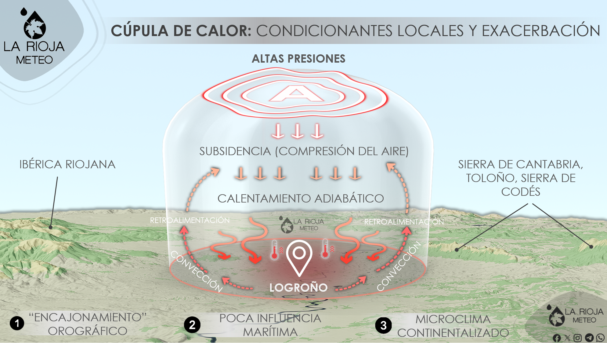 Este aire cálido descendente actúa como una tapa o cúpula que atrapa el aire caliente cerca del suelo, evitando que se renueve y favoreciendo que la masa de aire en superficie se vaya calentando cada vez más. El resultado es que el calor queda confinado, acumulándose y aumentando día tras día, sin necesidad de que masas de aire más cálidas, aporten más calor externo al sistema. Es decir, el sistema se retroalimenta a si mismo dentro de «esa cúpula».