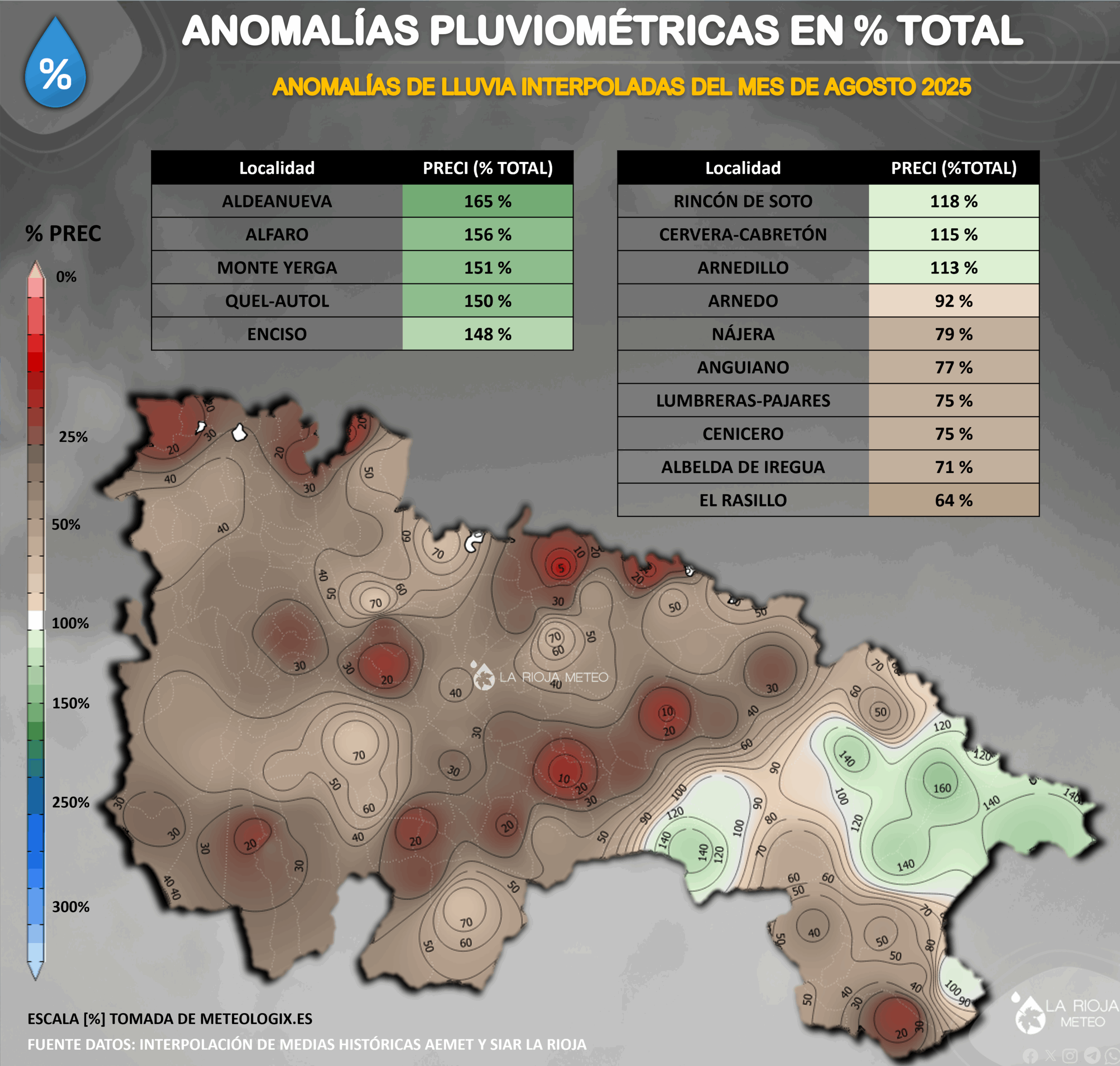 La comparación con la serie histórica revela un comportamiento muy húmedo en el este, con anomalías que en algunos casos superan en más del 150 % la media habitual. Encabezan el ranking Aldeanueva (165 %), Alfaro (156 %), Monte Yerga (151 %), Quel–Autol (150 %) y Enciso (149 %).