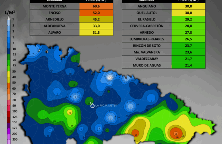 Señalamos como máximo exponente pluviométrico del mes el área de Monte Yerga, con más de 60 litros, junto con los más de 50 litros recogidos en Enciso y los 45 l/m² en Arnedillo. También en la ribera oriental se superaron los 30 l/m², con registros en Aldeanueva y Alfaro.
