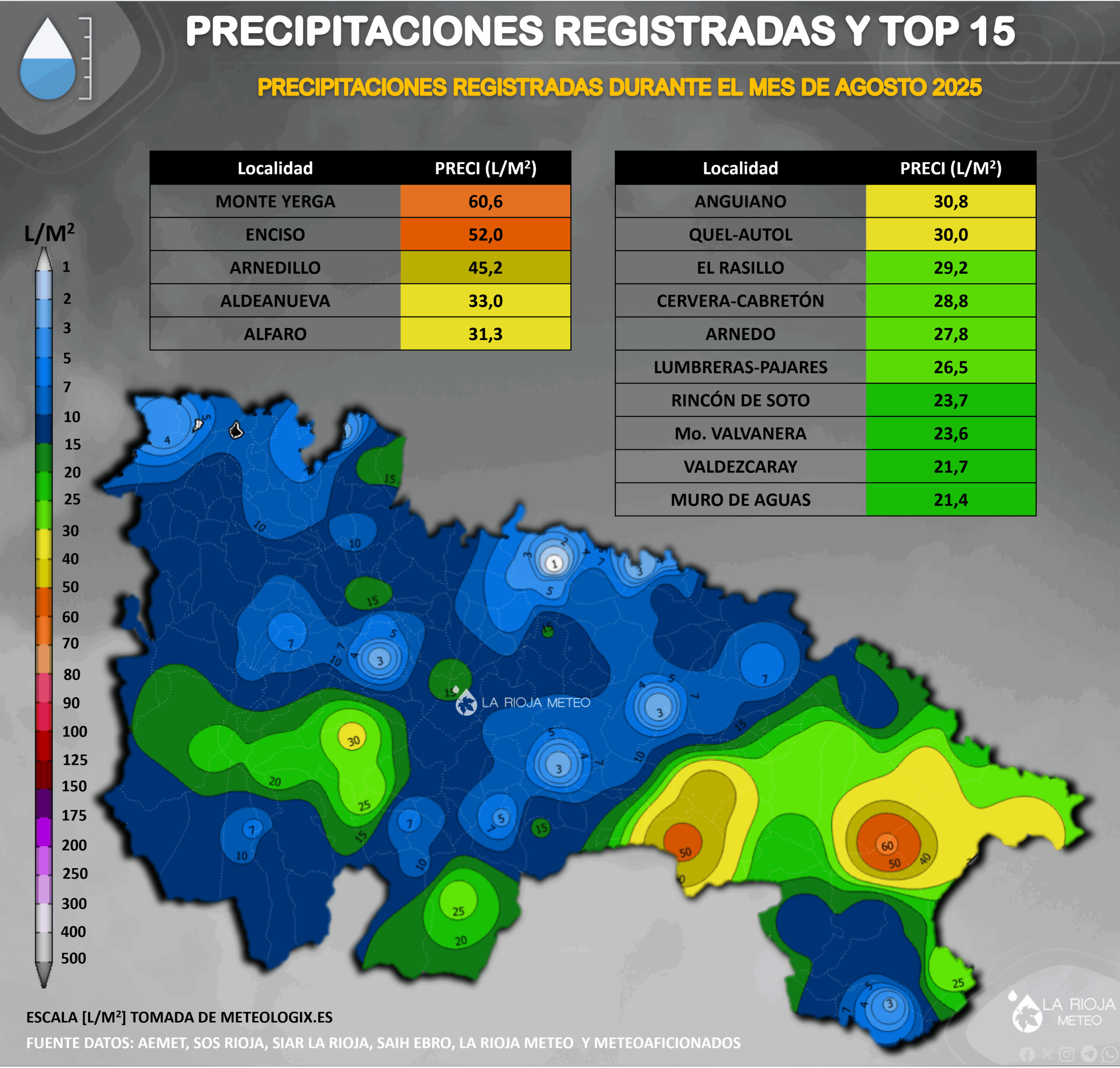 En el extremo opuesto encontramos la Rioja Alta y zonas de sierra, con acumulados más modestos en torno a los 20–25 litros, como en Valdezcaray, Monasterio de Valvanera o Muro de Aguas, todos ellos por debajo de lo normal para un mes de agosto. Pero la que destaca por muy escasas precipitaciones es la comarca de Logroño, donde en algunas estaciones no se llegaron a superar los 2 l/m².
